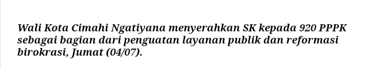 Penyerahan SK ini merupakan bagian dari upaya Pemkot Cimahi untuk memperkuat layanan dasar dan menciptakan birokrasi yang berdampak pada kesejahteraan masyarakat. (DG)