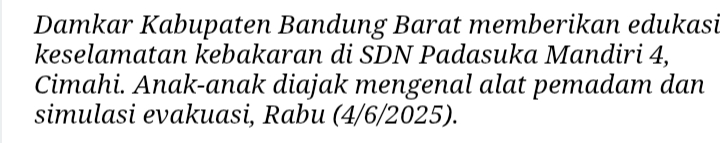 KOTA CIMAHI,RajindoNews.com – Dinas Pemadam Kebakaran Kabupaten Bandung Barat (Damkar KBB) memberikan edukasi kepada siswa-siswi SDN Padasuka Mandiri 4 di Kelurahan Padasuka, Kecamatan Cimahi Tengah, Kota Cimahi, pada Rabu (4/6/2025), terkait bahaya kebakaran dan pengenalan profesi pemadam kebakaran.