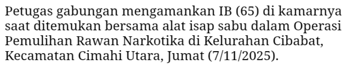 Dari hasil operasi di dua titik wilayah Kecamatan Cimahi Utara, petugas berhasil mengamankan seorang pria berinisial IB (65) yang diduga sebagai pengguna narkotika jenis sabu. Saat dilakukan penggeledahan di kamarnya di Kelurahan Cibabat, petugas menemukan alat isap sabu (bong) yang masih mengandung sisa pembakaran.