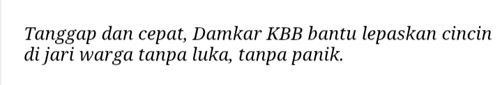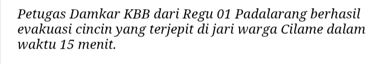 Pelapor atas nama Jul Solideo Daeli datang langsung ke Mako Damkar Padalarang sekitar pukul 10.40 WIB untuk meminta bantuan melepaskan cincin yang tersangkut di jarinya. Petugas yang sedang berjaga langsung merespons dan melakukan penanganan di lokasi.
