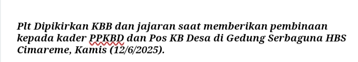 Kepala Bidang KB DP3KBP2A, Aam Kartifah, menjelaskan bahwa pembinaan ini merupakan bagian dari upaya berkelanjutan dalam memberikan edukasi dan peningkatan kapasitas kepada para kader desa, khususnya dalam hal penyuluhan KIE (Komunikasi, Informasi, dan Edukasi).