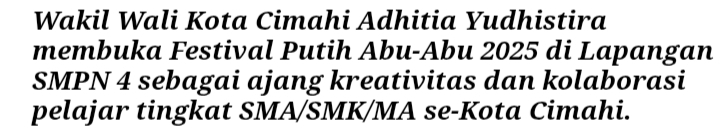 Wakil Wali Kota Cimahi, Adhitia Yudhistira, yang hadir membuka acara, menegaskan bahwa festival ini merupakan ruang ekspresi bagi generasi muda untuk menunjukkan jati diri yang berkarakter, berprestasi, dan berwawasan kebangsaan.
