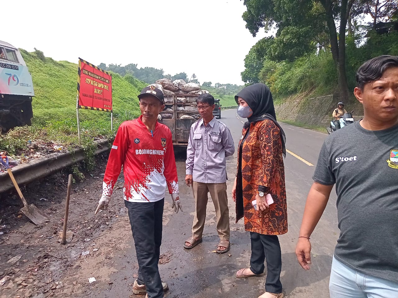 Camat Ngamprah Agnes Virganty bersama Kepala Desa Bojong Koneng Tarmaya, S.Pd dan Tim Desa Siaga meninjau langsung kegiatan kebersihan lingkungan di jalan provinsi yang menjadi wajah desa.
