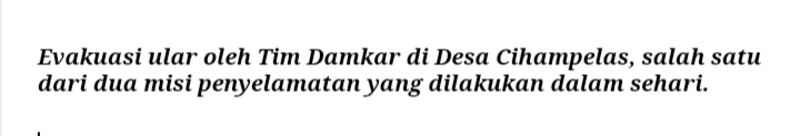 Penyelamatan kedua terkait evakuasi seekor ular yang ditemukan warga di Kampung Cihampelas RT 04 RW 02, Desa Cihampelas, Kecamatan Cihampelas. Laporan diterima pukul 24.40 WIB, dan tim tiba di lokasi pada pukul 00.00 WIB. Ular berhasil diamankan tanpa menimbulkan gangguan lebih lanjut dan proses selesai pada pukul 00.16 WIB.
