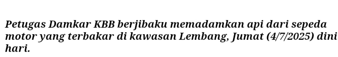 Insiden kebakaran terjadi pada satu unit sepeda motor di Jalan Raya Tangkuban Perahu, tepatnya di depan Bukit Strobery, Kecamatan Lembang, KBB. Informasi diterima oleh petugas pukul 00.00 WIB, dan unit Damkar tiba di lokasi dalam waktu 5 menit. Penanganan dimulai pukul 00.08 WIB dan berhasil dikendalikan sepenuhnya pada 00.30 WIB. Tidak ada korban jiwa dalam peristiwa tersebut.