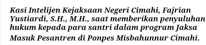 Kejaksaan Negeri Cimahi melalui Seksi Intelijen menyelenggarakan penyuluhan hukum bertema “Penguatan Nilai-Nilai Pancasila melalui Kepatuhan Hukum” di Pondok Pesantren Tahfidz Al-Qur’an Misbahunnur, Jalan Kolonel Masturi No. 272, Cimahi Utara, Selasa (18/11/2025).