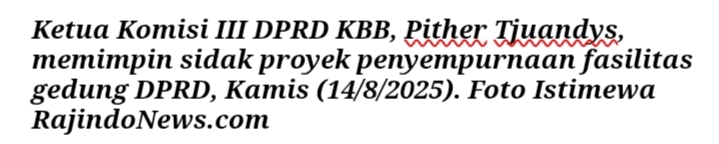 BANDUNG BARAT, RajindoNews.com – Komisi III DPRD Kabupaten Bandung Barat (KBB) melakukan inspeksi mendadak (sidak) terhadap kelanjutan pekerjaan penyempurnaan sarana dan prasarana gedung DPRD KBB agar layak dan optimal digunakan. Sidak dipimpin langsung Ketua Komisi III, Pither Tjuandys, S.IP., M.M., yang menegaskan bahwa pengawasan ini penting untuk memastikan proyek selesai tepat waktu dan sesuai spesifikasi.
