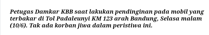“Kami langsung terjunkan dua unit pancar dari Pos Padalarang setelah menerima laporan. Setibanya di lokasi, petugas langsung melaksanakan pemadaman hingga selesai pendinginan dan pendataan,” ujar Kepala Dinas Pemadam Kebakaran dan Penyelamatan KBB, Siti Aminah, dalam keterangannya, Rabu (11/6).