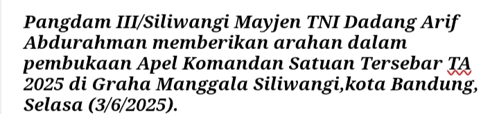 KOTA BANDUNG,RajindoNews.com – Panglima Kodam III/Siliwangi Mayjen TNI Dadang Arif Abdurahman, S.E., M.Si., CHRMP. secara resmi membuka Apel Komandan Satuan (AKS) Tersebar Kodam III/Siliwangi Tahun Anggaran 2025 di Graha Manggala Siliwangi, Jalan Aceh, Kota Bandung, Selasa (3/6/2025).