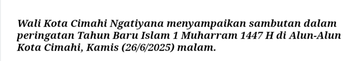 Wali Kota Cimahi, Ngatiyana, dalam sambutannya menegaskan bahwa peringatan Tahun Baru Islam bukan sekadar seremoni tahunan, tetapi merupakan momentum muhasabah dan ajakan hijrah untuk memperbaiki diri ke arah yang lebih baik.