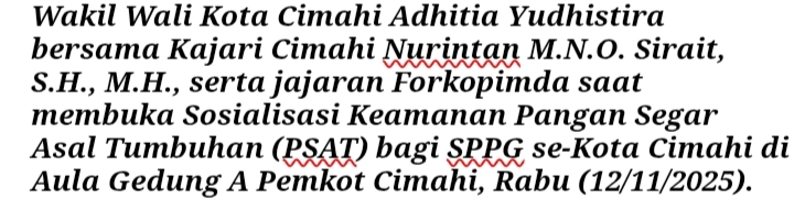 CIMAHI, RajindoNews.com – Pemerintah Kota Cimahi menegaskan pentingnya keamanan pangan dalam pelaksanaan Program Makan Bergizi Gratis (MBG) bagi masyarakat, khususnya anak-anak sekolah. Melalui Dinas Pangan dan Pertanian (Dispangtan), Pemkot Cimahi menggelar Sosialisasi Keamanan Pangan Segar Asal Tumbuhan (PSAT) bagi Satuan Pelayanan Pemenuhan Gizi (SPPG) se-Kota Cimahi, di Aula Gedung A Pemerintah Kota Cimahi,Rabu (12/11/2025).