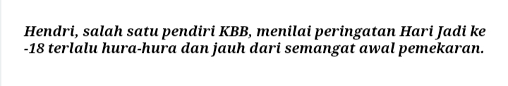 Menurutnya, cita-cita awal pembentukan KBB yang tercermin dalam motto “Wibawa Mukti Kerta Raharja” seharusnya menjadi pedoman utama dalam setiap kegiatan pemerintahan, termasuk dalam memperingati hari jadi daerah.