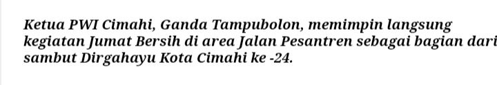 Aksi bersih-bersih ini dilaksanakan pada Jumat pagi (20/6/2025), dipimpin langsung oleh Ketua PWI Cimahi, Ganda Tampubolon. Kegiatan dimulai dari area trotoar pertigaan Jalan Pesantren, depan Kantor Inspektorat Kota Cimahi, hingga ke Kantor PWI Cimahi. Sejumlah pengurus dan anggota turut ambil bagian dalam aksi tersebut.