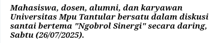 JAKARTA,RajindoNews.com – Fakultas Ilmu Komunikasi Universitas Mpu Tantular (UMT) sukses menyelenggarakan webinar bertajuk Ngobrol Sinergi bersama mahasiswa, alumni, dan Serikat Pekerja Dosen dan Karyawan (SPD-K) UMT pada Sabtu (26/7/2025) secara daring melalui platform Zoom Meeting.