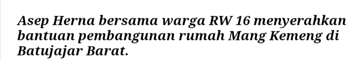 Penyerahan bantuan dipimpin oleh Ketua RW 16 blok Sinarjaya, Asep Herna. Meski baru menjabat kurang dari enam bulan, kepemimpinannya dikenal dekat dengan warga karena kepeduliannya terhadap kegiatan sosial dan perhatian terhadap warga yang membutuhkan. Asep bersama beberapa warga RW 16 mendatangi langsung lokasi pembangunan rumah Mang Kemen.